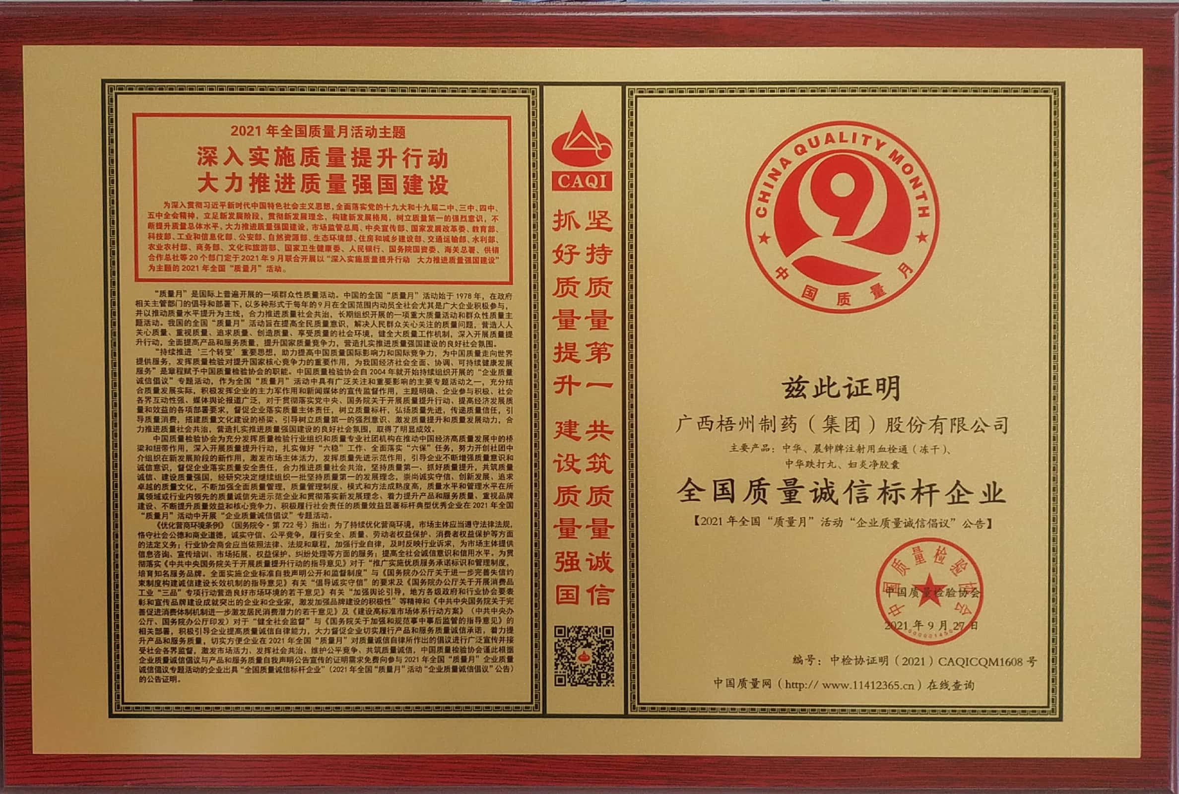在2021年全國(guó)"質(zhì)量月"活動(dòng)中榮獲 全國(guó)質(zhì)量誠(chéng)信標(biāo)桿 企業(yè)稱號(hào)。