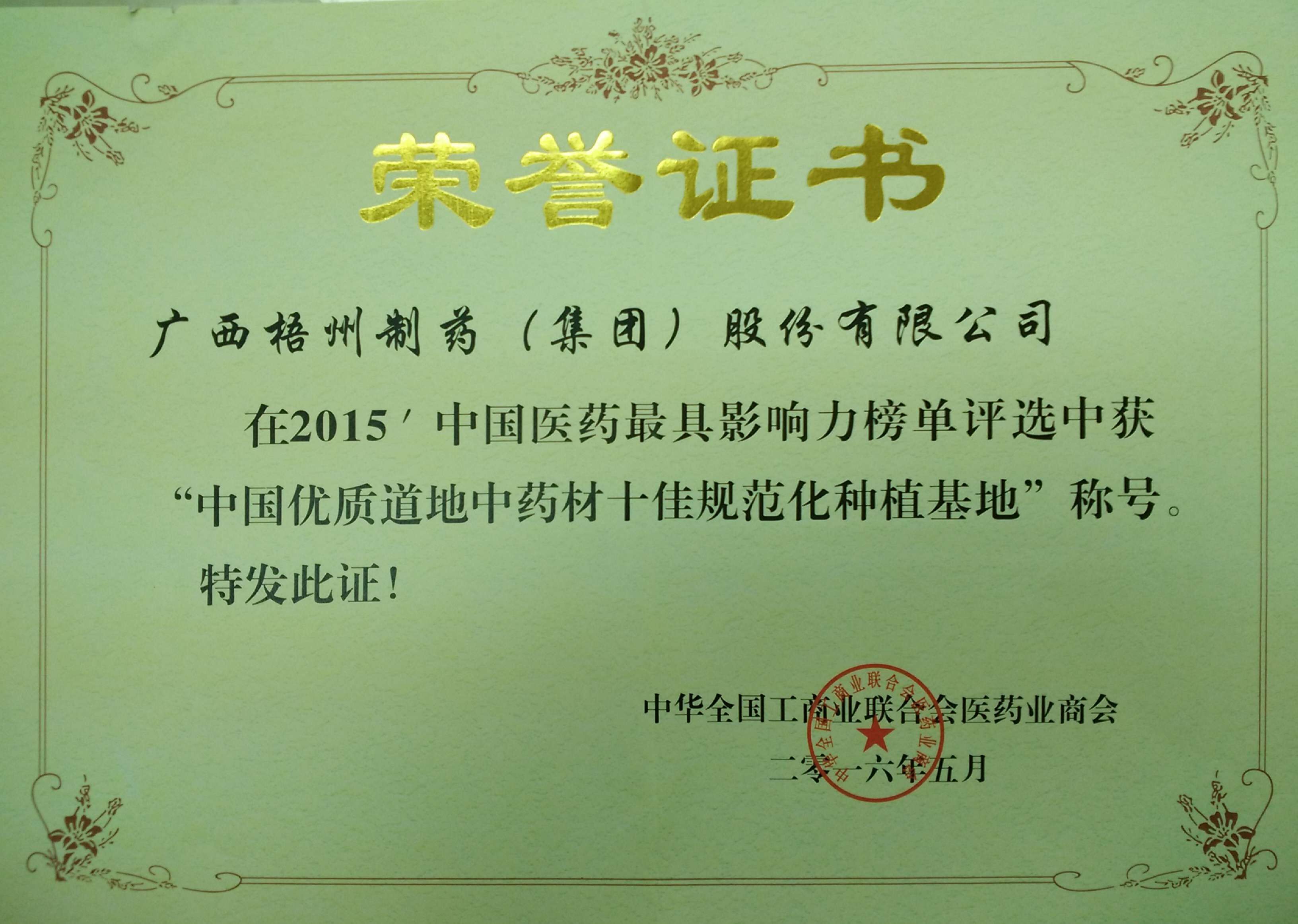 榮獲2015年度中國(guó)優(yōu)質(zhì)道地中藥材十佳規(guī)范化種植基地稱(chēng)號(hào)