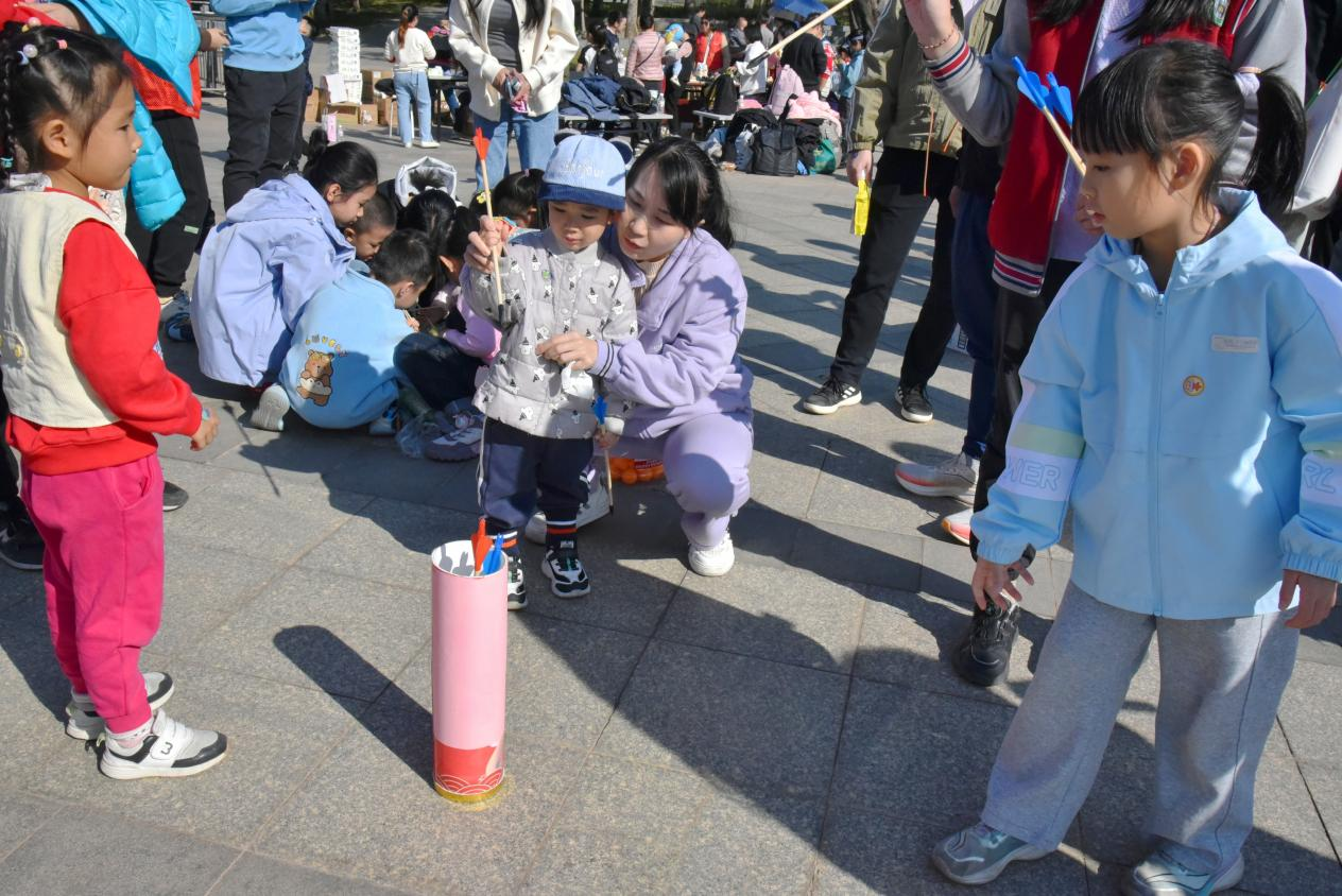 上午9時(shí)30分,活動(dòng)正式拉開帷幕,一場場充滿趣味與溫情的親子游戲輪番上演。“珠行萬里”項(xiàng)目中,家長與孩子手持半圓槽拼接通道,小球滑落時(shí)共同默契重整,掌心相對間不僅傳遞著力量,更凝聚著親情;壺中“箭”寶環(huán)節(jié)融入傳統(tǒng)元素,家長們手把手帶領(lǐng)孩子瞄準(zhǔn)投擲,每一次成功入壺都引發(fā)全場歡呼;“筷子夾乒乓球”項(xiàng)目磨練耐心技巧,孩子們模仿家長動(dòng)作小心翼翼夾球,有的家庭還創(chuàng)意發(fā)明“接力夾球”玩法,現(xiàn)場加油聲、歡呼聲交織成群。